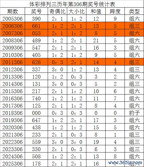 陈设三第2025306期奖号为178,奇偶比为2:1,大小比为2:1,和值为16,跨度为7。
